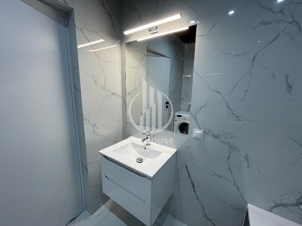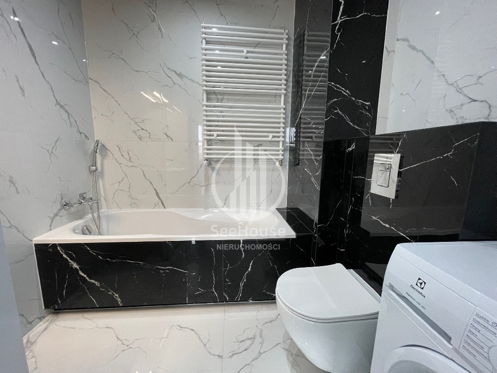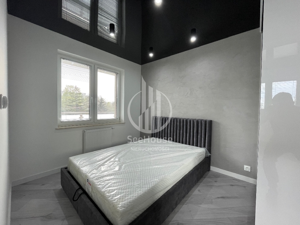 W salonie i sypialni lustrzany sufit napinany z oświetleniem. Mieszkanie jest w pełni umeblowane i wyposażone.