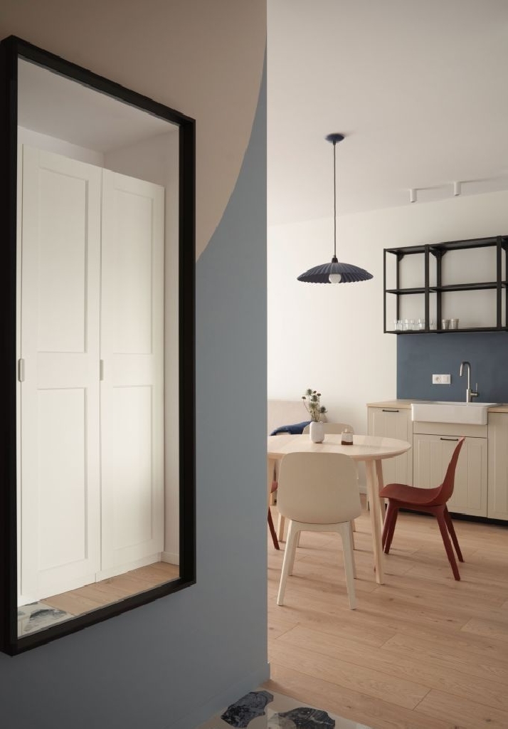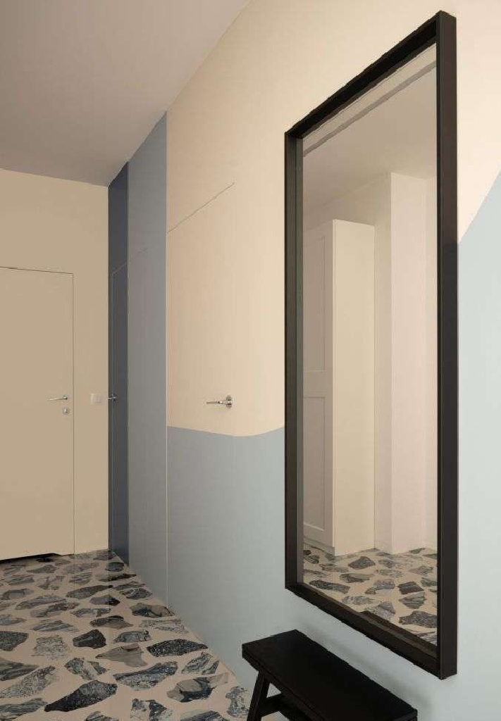 - Przedpokoju - z dwoma szafami, wszystkie drzwi z ukrytymi ościeżnicami, na ścianie mural