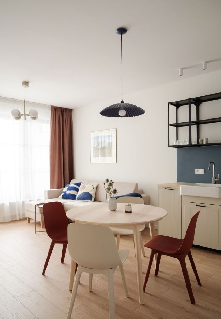 - Salonu z aneksem kuchennym - z wyjściem na przestronny balkon. Wyposażenie - kanapa narożna z funkcją spania, telewizor, strefa jadalna. W kuchni stylowa lodówko-zamrażarka, płyta indukcyjna, piekarnik, zmywarka