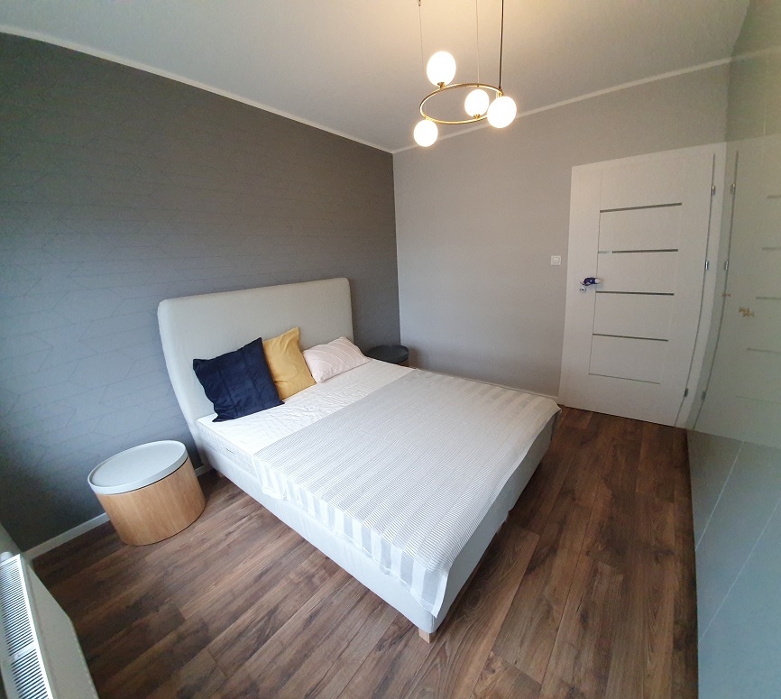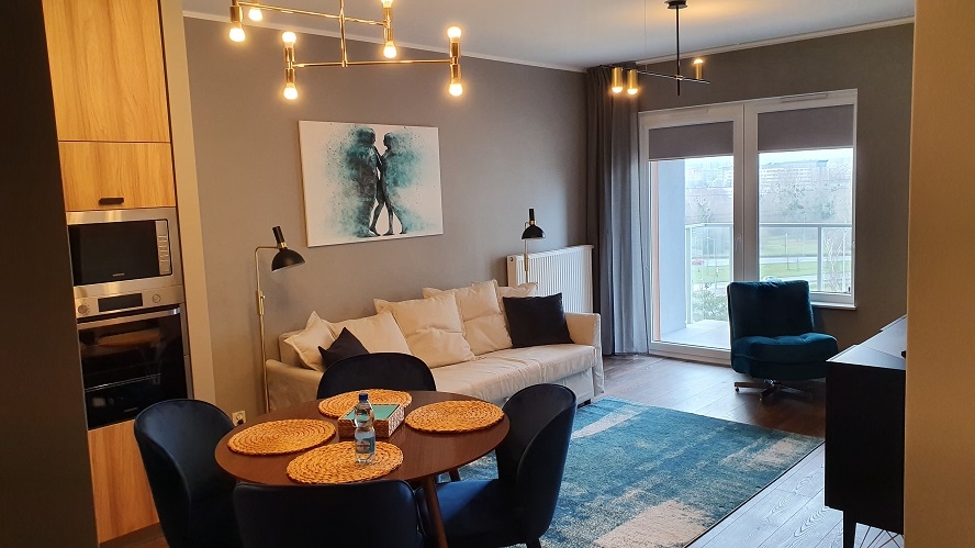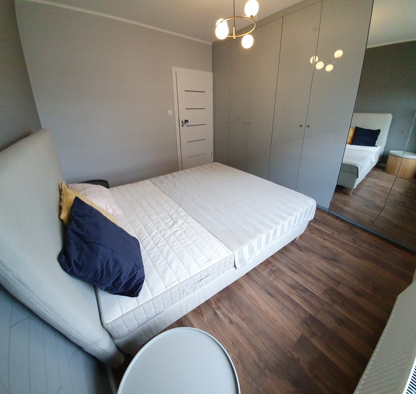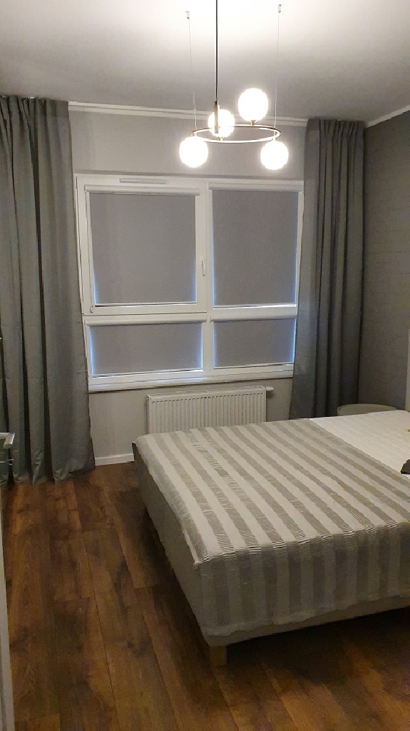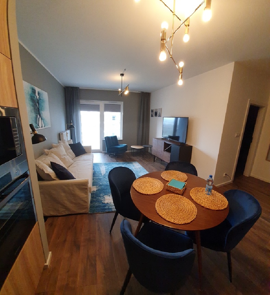 Mieszkanie znajduje się na 7 piętrze 13 piętrowego apartamentowca i składa się z salonu z aneksem kuchennym z wyjściem na balkon (nowoczesny, wysokiej klasy, energooszczędny sprzęt AGD w zabudowie - lodówko-zamrażarka, zmywarka, piekarnik, mikrofala, sztućce, garnki etc., TV samsung 4K 55"), sypialni (łóżko sypialniane z wygodnym materacem, bardzo pojemna szafa w zabudowie) oraz łazienki (pralka, prysznic). Do mieszania przynależy komórka lokatorska oraz miejsce parkingowe w podziemnej hali garażowej (dodatkowo płatne 200 zł).