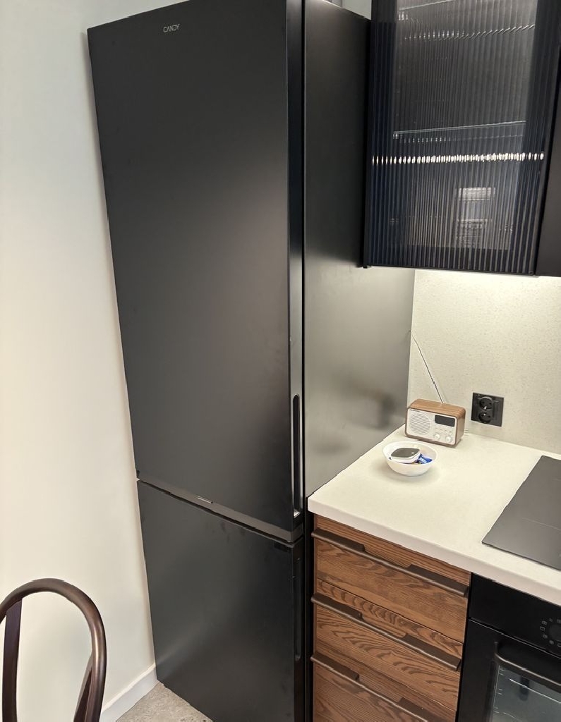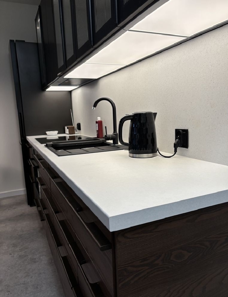 - Salon z aneksem kuchennym – kanapa dwuosobowa, stół 90x90 cm (rozkładany do 190cm) z krzesłami, telewizor, przestronny aneks kuchenny z dużą ilością szafek do przechowywania oraz sprzętem AGD (lodówka, płyta indukcyjna, piekarnik, zmywarka)