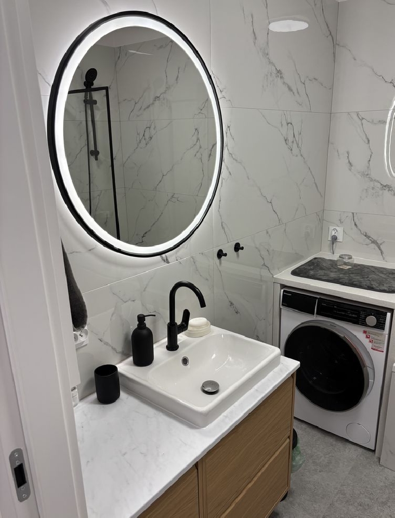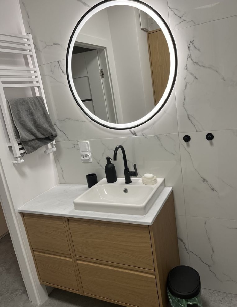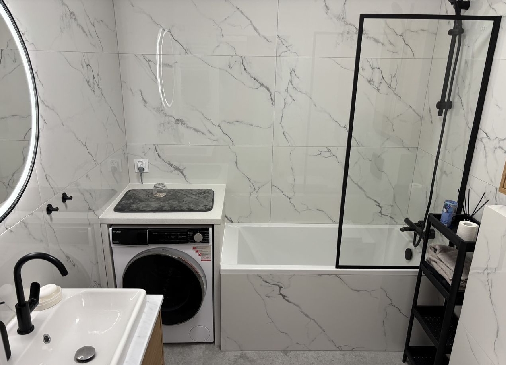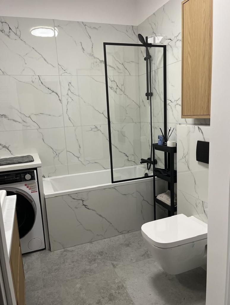 - Łazienka – wanna i prysznic, pralka, nad toaletą pojemna szafka, pod zlewem szafka