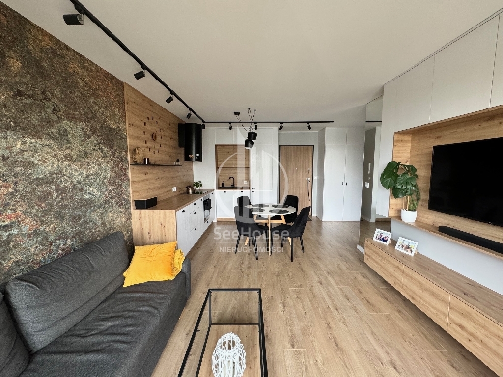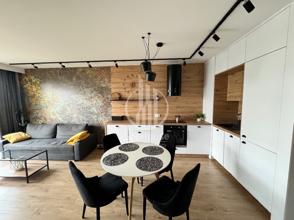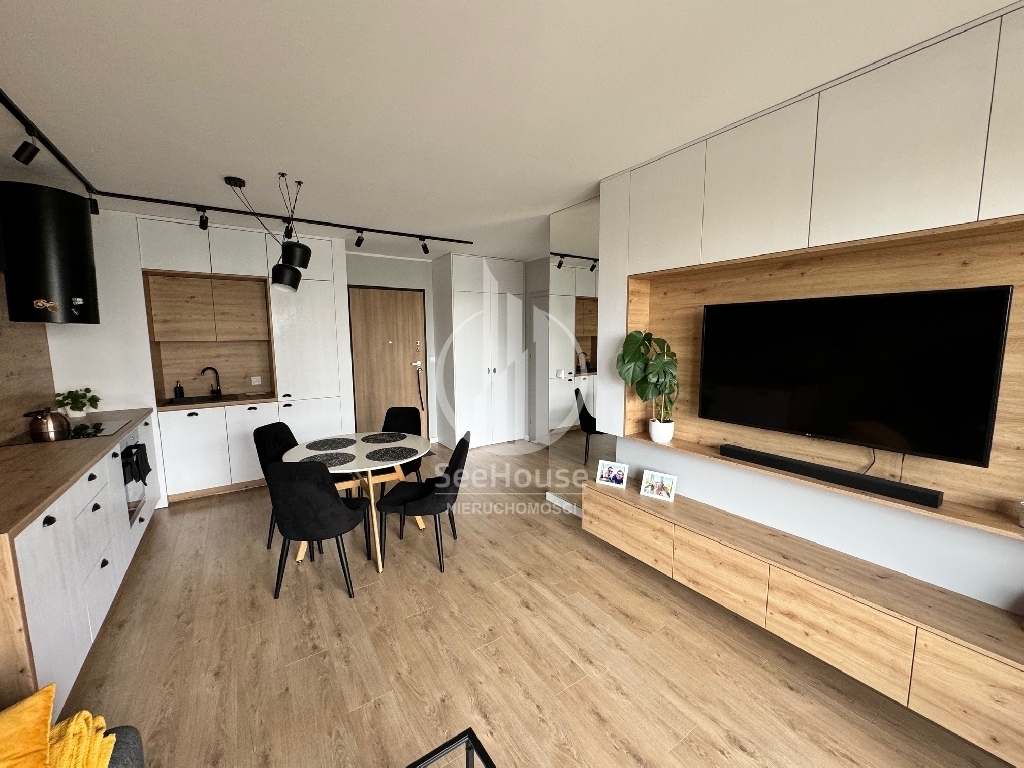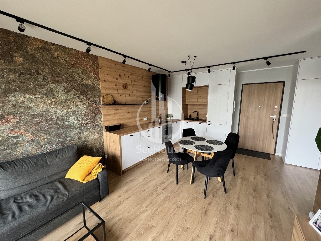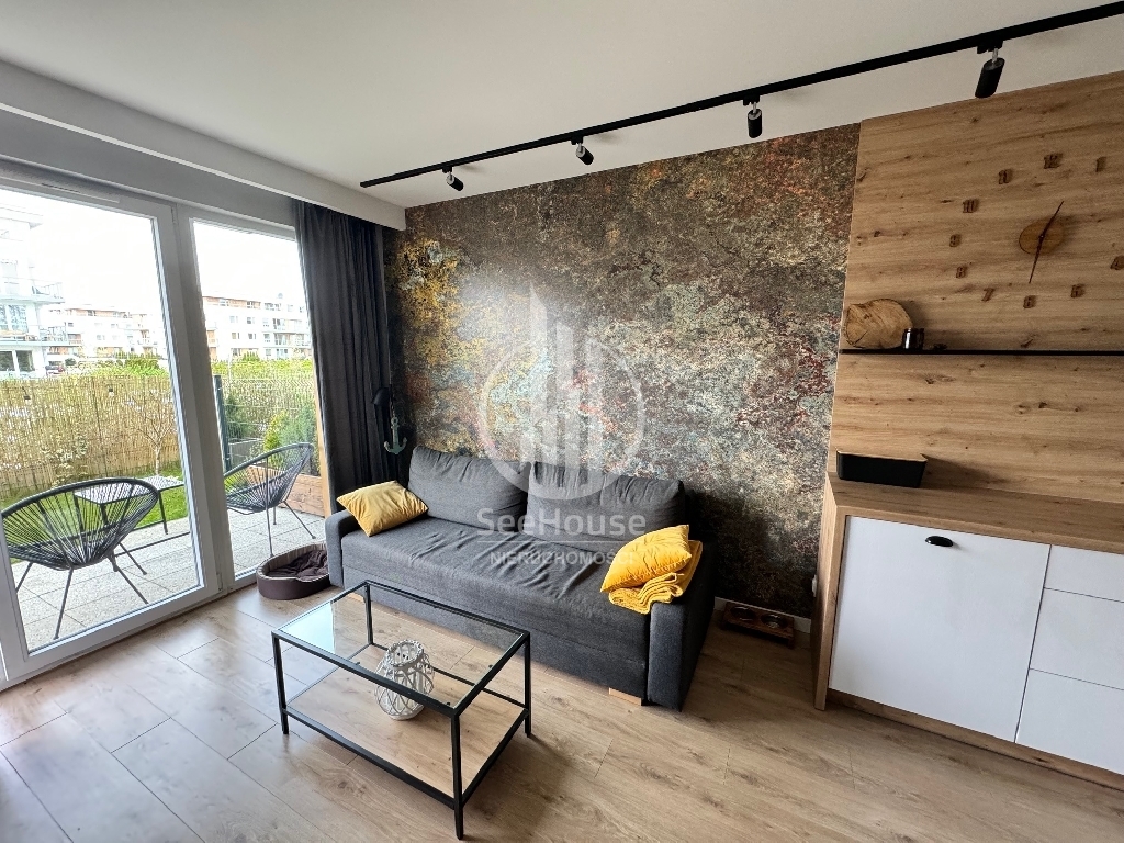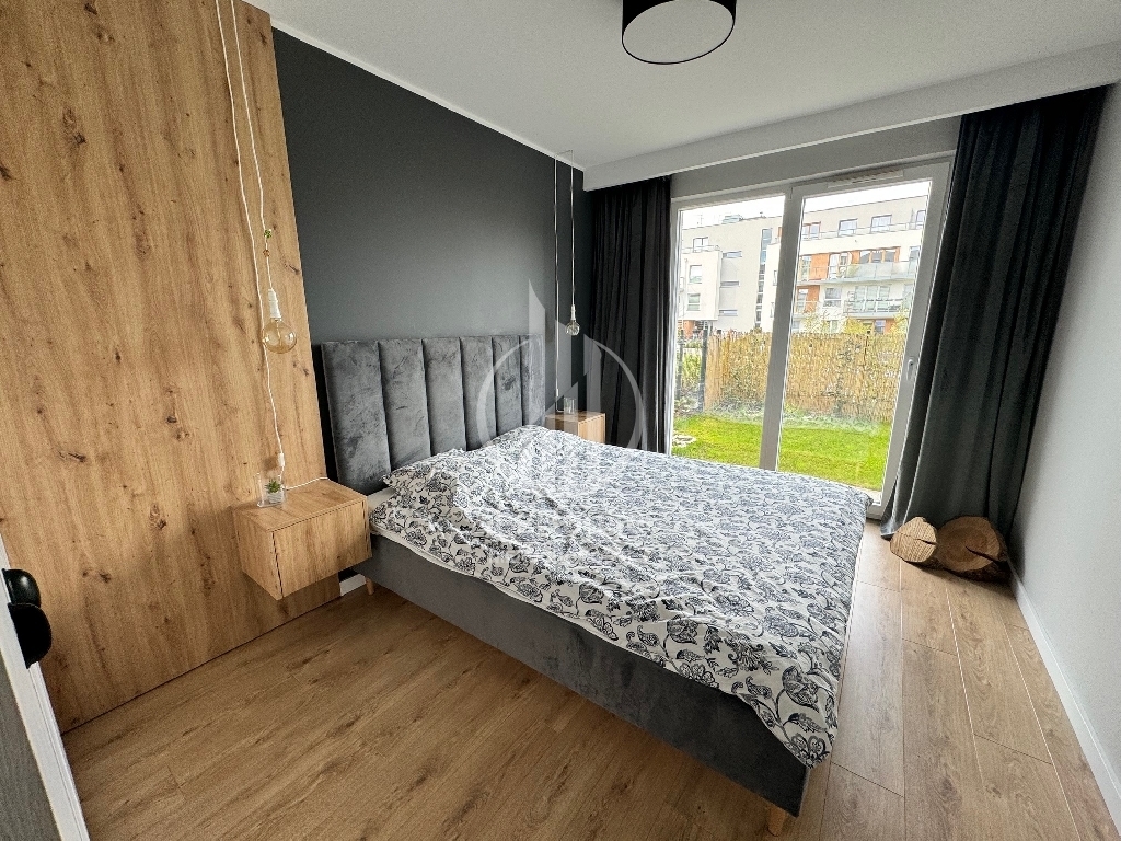 Mieszkanie znajduje się na parterze i składa się salonu z aneksem kuchennym, sypialni z szafą w zabudowie i dużym łóżkiem, łazienki z prysznicem oraz przedpokoju z pojemną szafą. Z salonu i sypialni wyjściem na duży ogródek. Mieszkanie zaprojektowane przez architekta, bardzo funkcjonalne, wykonane z najwyższej klasy materiałów oraz z ciekawym oświetleniem wzbogaconym o elementy LED w kuchni, salonie oraz łazience. Cała stolarka, czyli kuchnia, szafy, elementy ścian wykonana została pod wymiar przez stolarza włącznie z łóżkiem sypialnianym i materacem. Jest w pełni wyposażone w wysokiej klasy sprzęt AGD, pralkę, lodówkę, piekarnik, zmywarkę oraz płytę grzewczą w zabudowie.