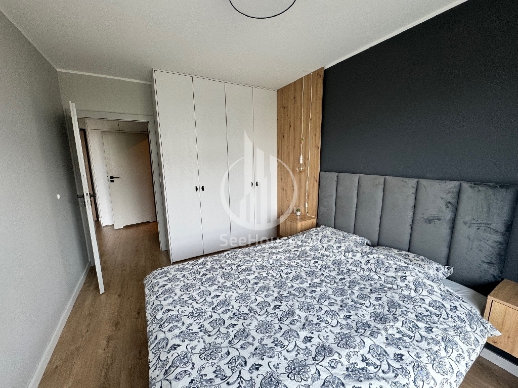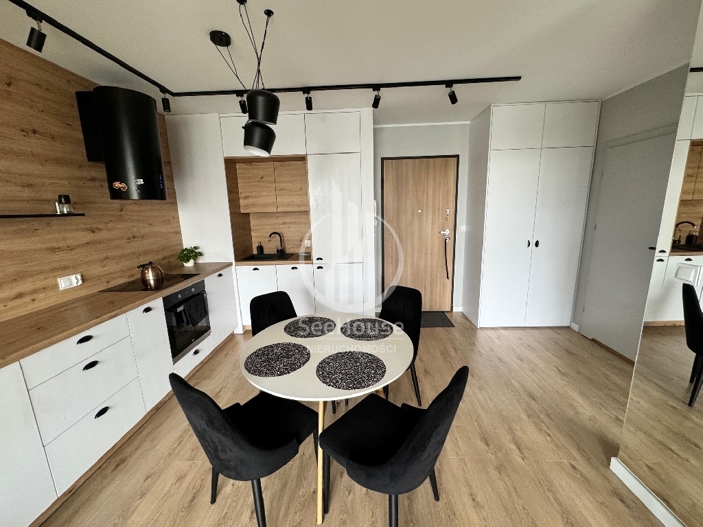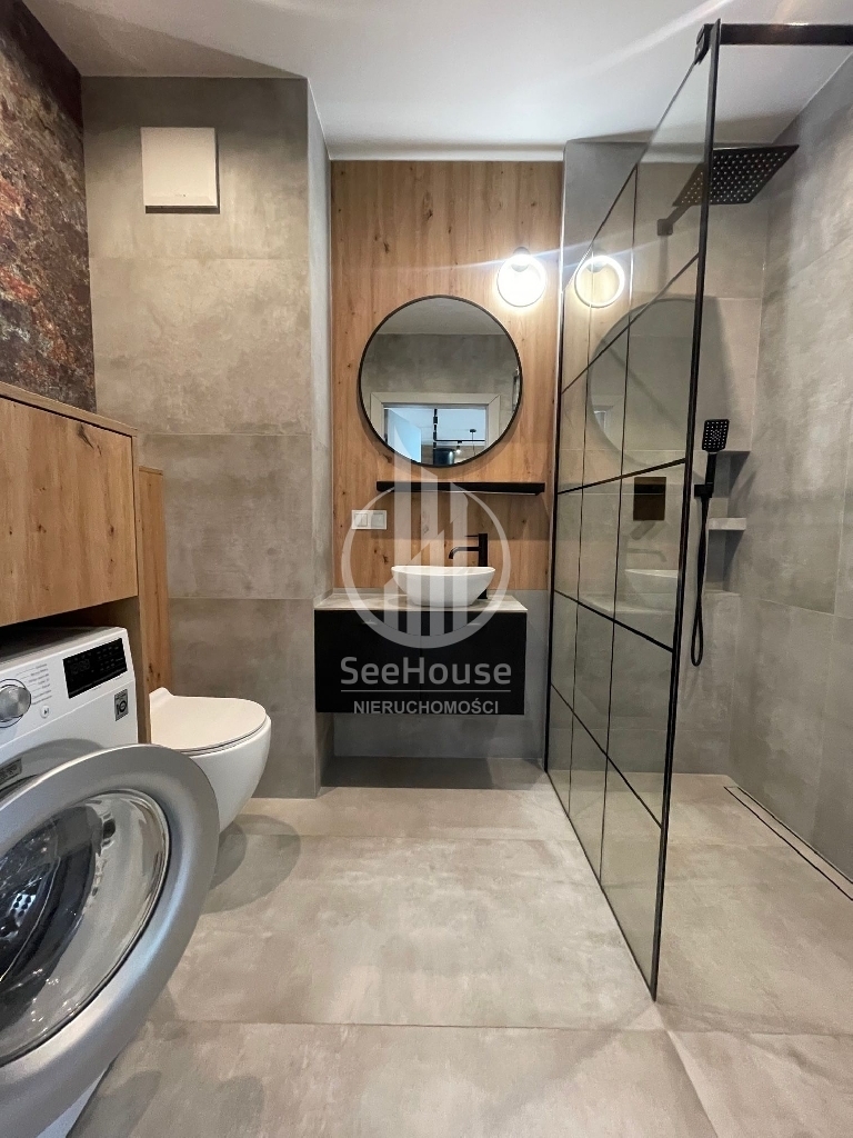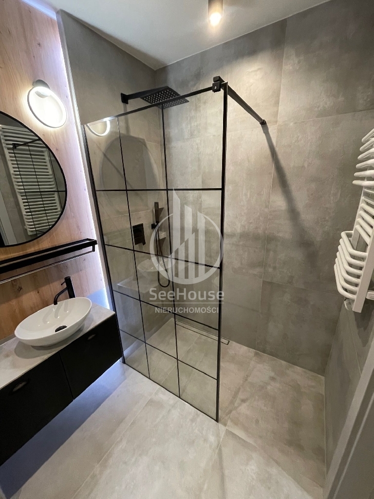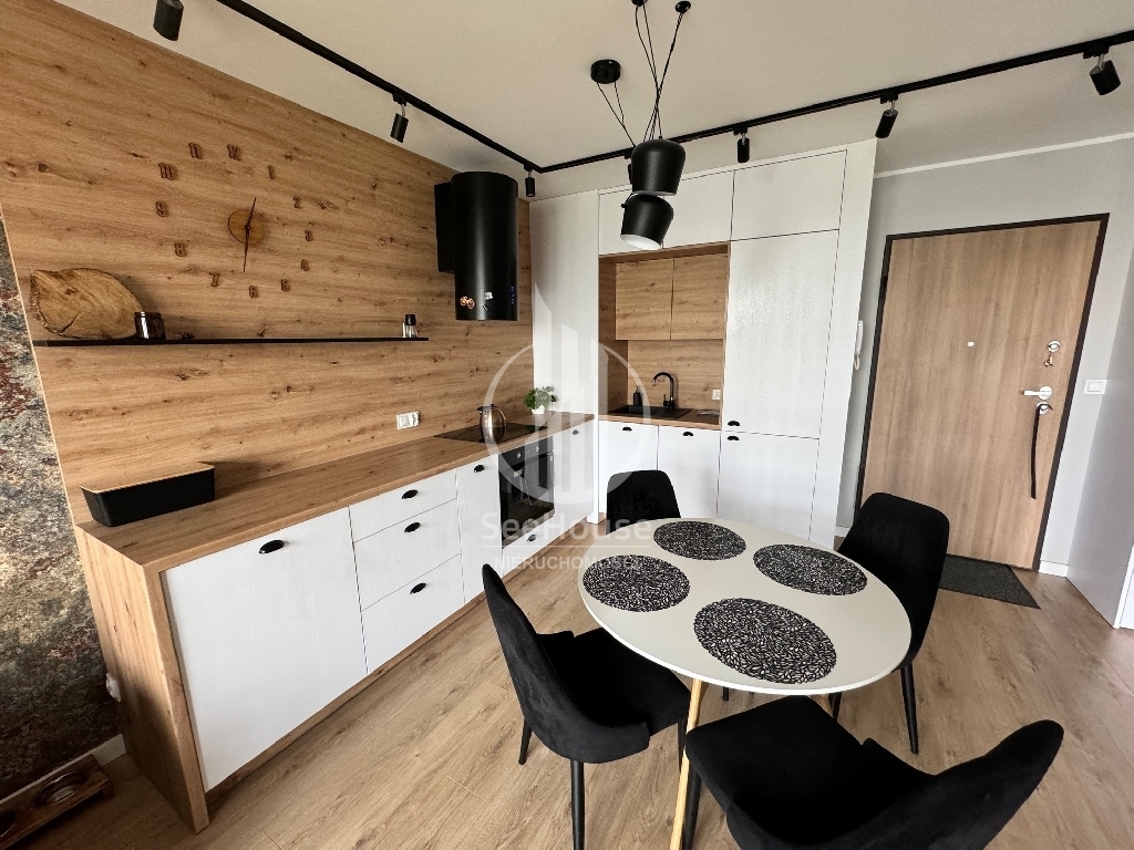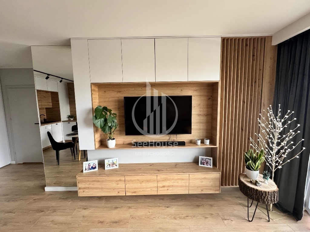 Mieszkanie znajduje się na parterze i składa się salonu z aneksem kuchennym, sypialni z szafą w zabudowie i dużym łóżkiem, łazienki z prysznicem oraz przedpokoju z pojemną szafą. Z salonu i sypialni wyjściem na duży ogródek. Mieszkanie zaprojektowane przez architekta, bardzo funkcjonalne, wykonane z najwyższej klasy materiałów oraz z ciekawym oświetleniem wzbogaconym o elementy LED w kuchni, salonie oraz łazience. Cała stolarka, czyli kuchnia, szafy, elementy ścian wykonana została pod wymiar przez stolarza włącznie z łóżkiem sypialnianym i materacem. Jest w pełni wyposażone w wysokiej klasy sprzęt AGD, pralkę, lodówkę, piekarnik, zmywarkę oraz płytę grzewczą w zabudowie.