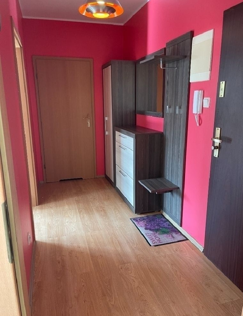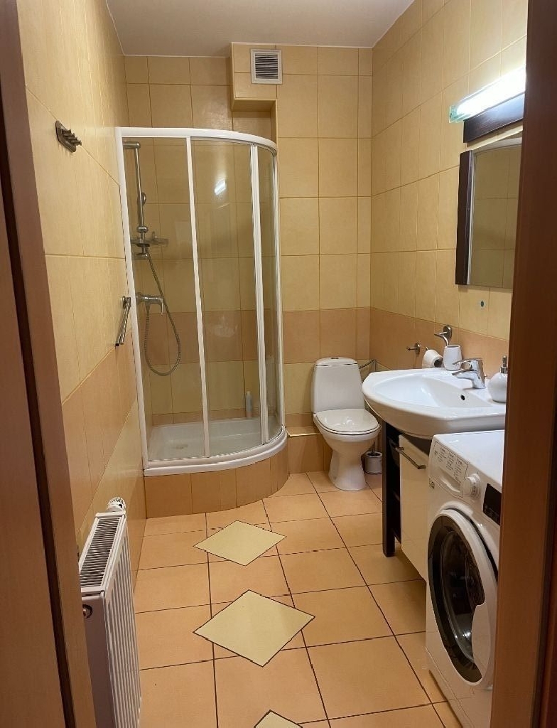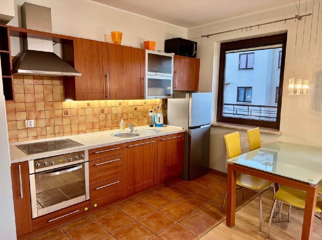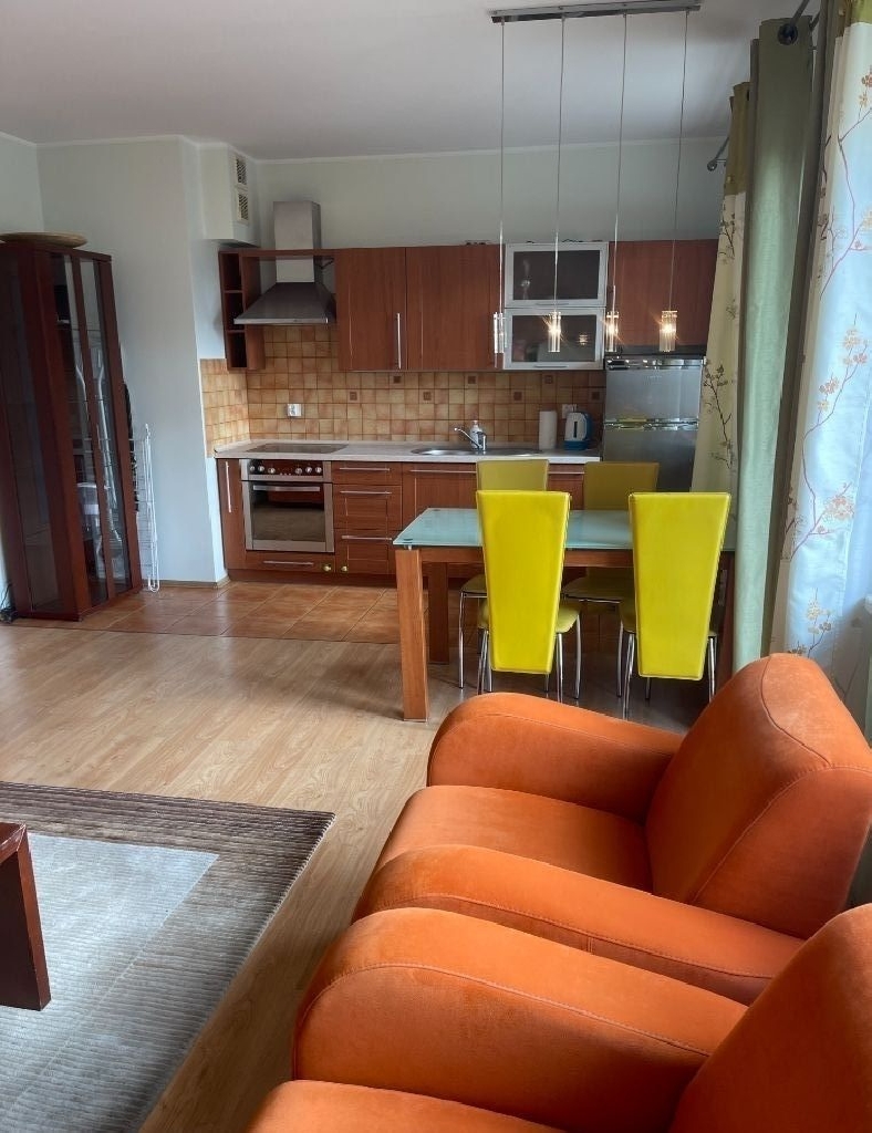 Mieszkanie znajduje się na 2 piętrze i składa się z salonu z aneksem kuchennym z wyjściem na taras, sypialni, łazienki oraz przedpokoju. Kuchnia zabudowa, wyposażona (lodówko-zamrażarka, płyta grzewcza, piekarnik, pochłaniacz powietrza). Mieszkanie całkowicie wyposażone (telewizor, zestaw wypoczynkowy, łóżko, szafy, regały, stół, krzesła, pralka).