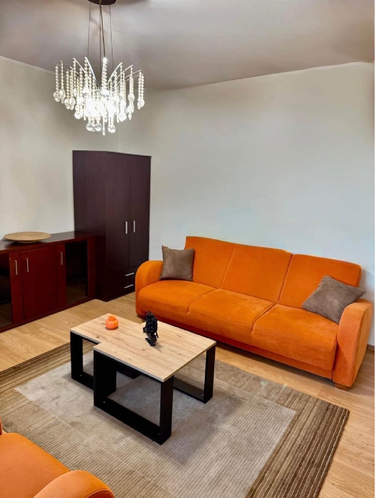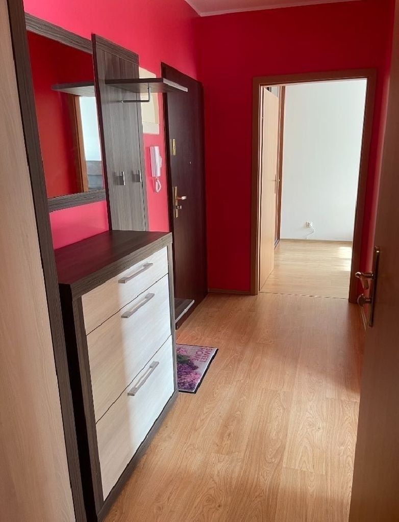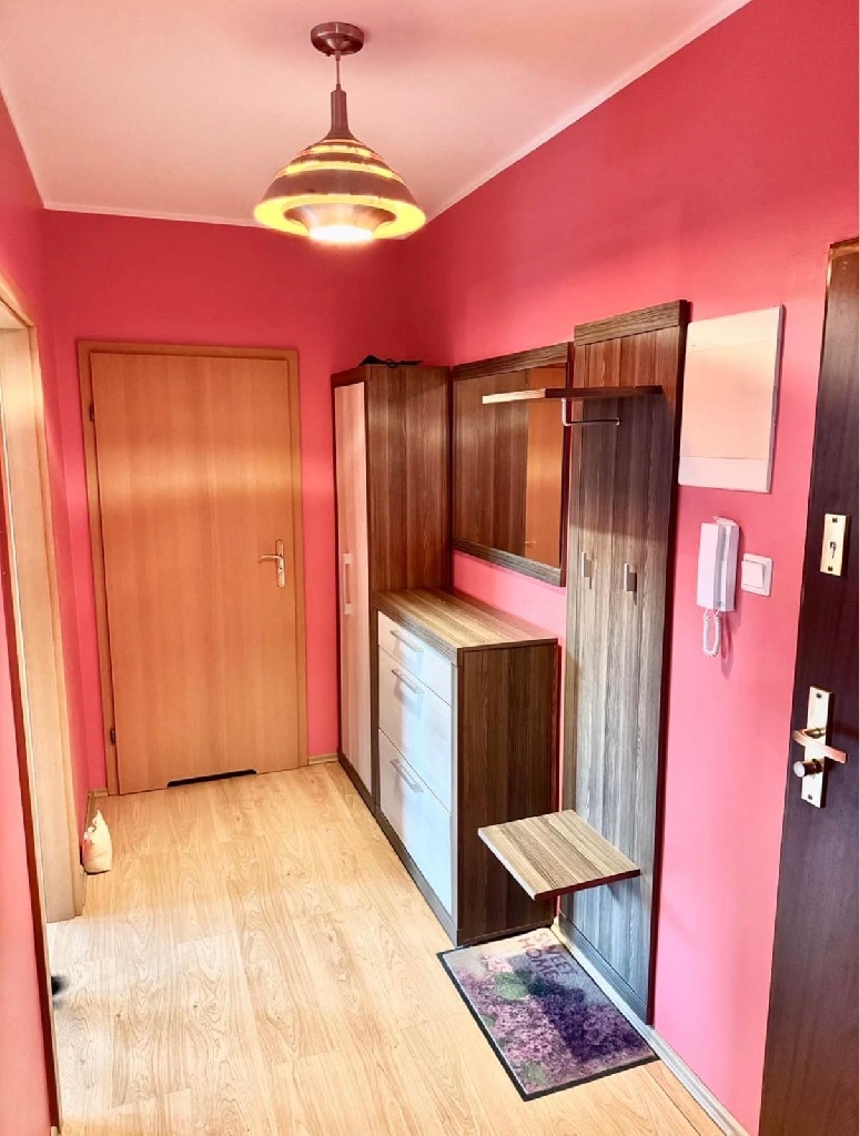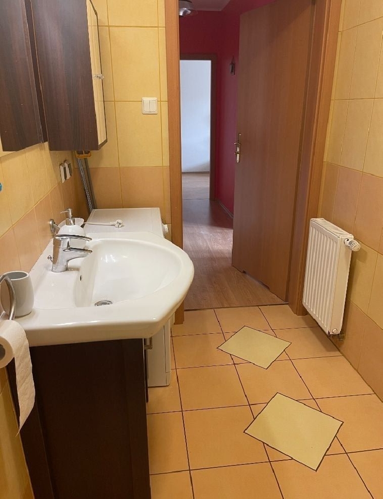 Mieszkanie znajduje się na 2 piętrze i składa się z salonu z aneksem kuchennym z wyjściem na taras, sypialni, łazienki oraz przedpokoju. Kuchnia zabudowa, wyposażona (lodówko-zamrażarka, płyta grzewcza, piekarnik, pochłaniacz powietrza). Mieszkanie całkowicie wyposażone (telewizor, zestaw wypoczynkowy, łóżko, szafy, regały, stół, krzesła, pralka).